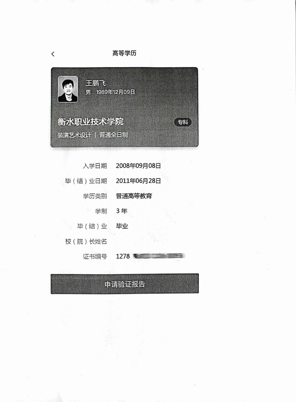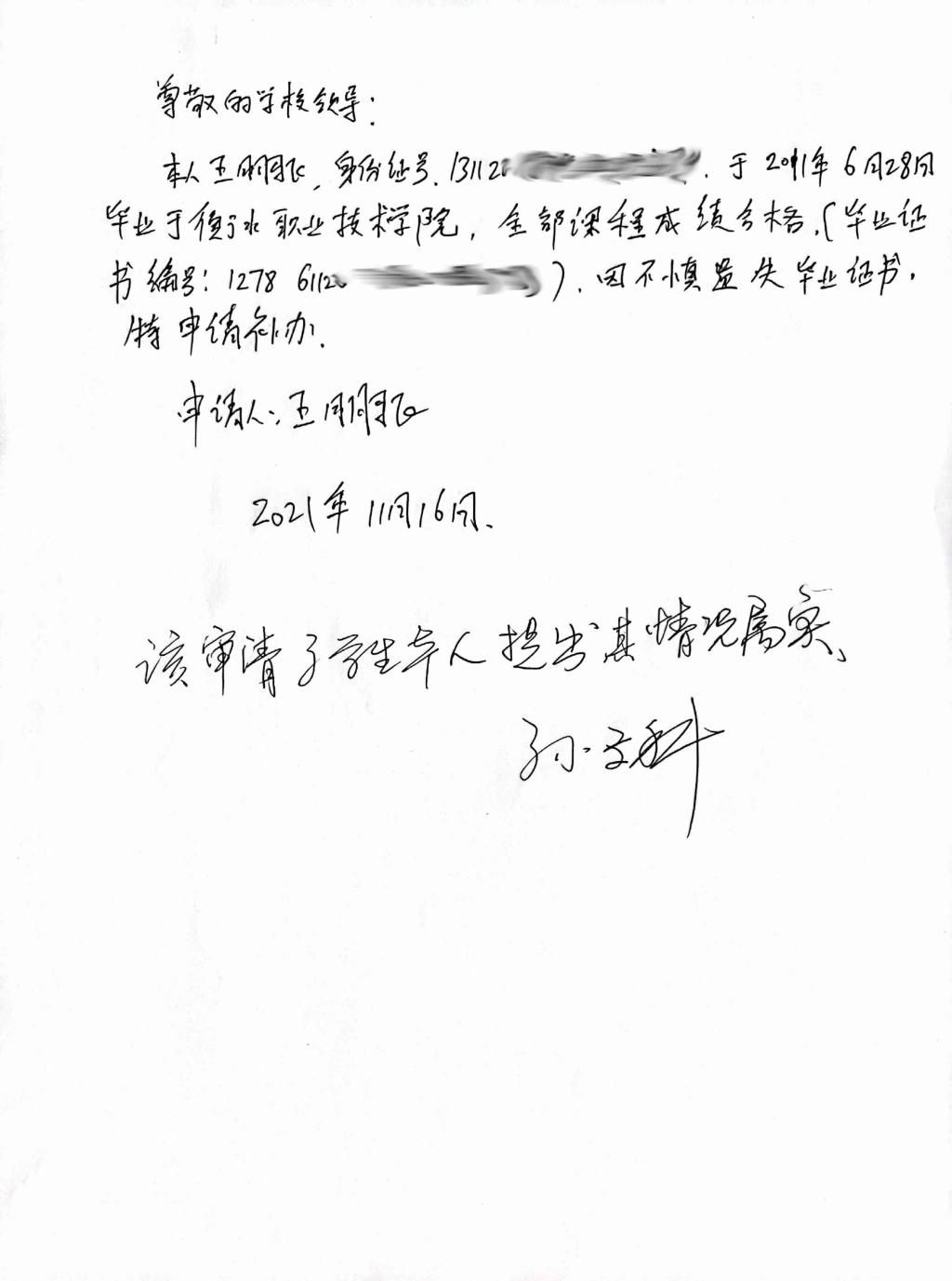 我院2008级艺术系装潢艺术设计专业学生王鹏飞,于2011年6月毕业,毕业证书编号:127861201106000958,因个人保管不当,毕业证书丢失,现提出补办毕业证明书。经所在系、处室核实,确认学生情况属实,符合补办毕业证明书要求,经院领导研究,拟同意为王鹏飞补办毕业证明书,特此公示。