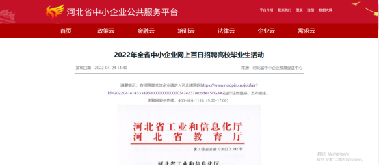 1.进入河北省中小企业公共服务平台--2022年全省中小企业网上百日招聘高校毕业生活动页面。网址https://www.nuopin.cn/jobfair?id=202204141433349380000000000003474237&code=5FGAX2